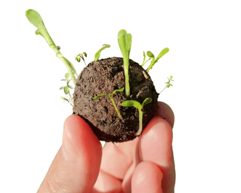 The seed bombs are formed using natural clay and compost, which help protect the seeds until conditions are suitable for germination. No gardening tools are required.