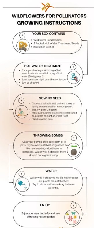 Each pack includes a combination of throw-and-grow seed bombs and hot water treatment seed bombs, supplied in a biodegradable germination bag with a full instruction leaflet.