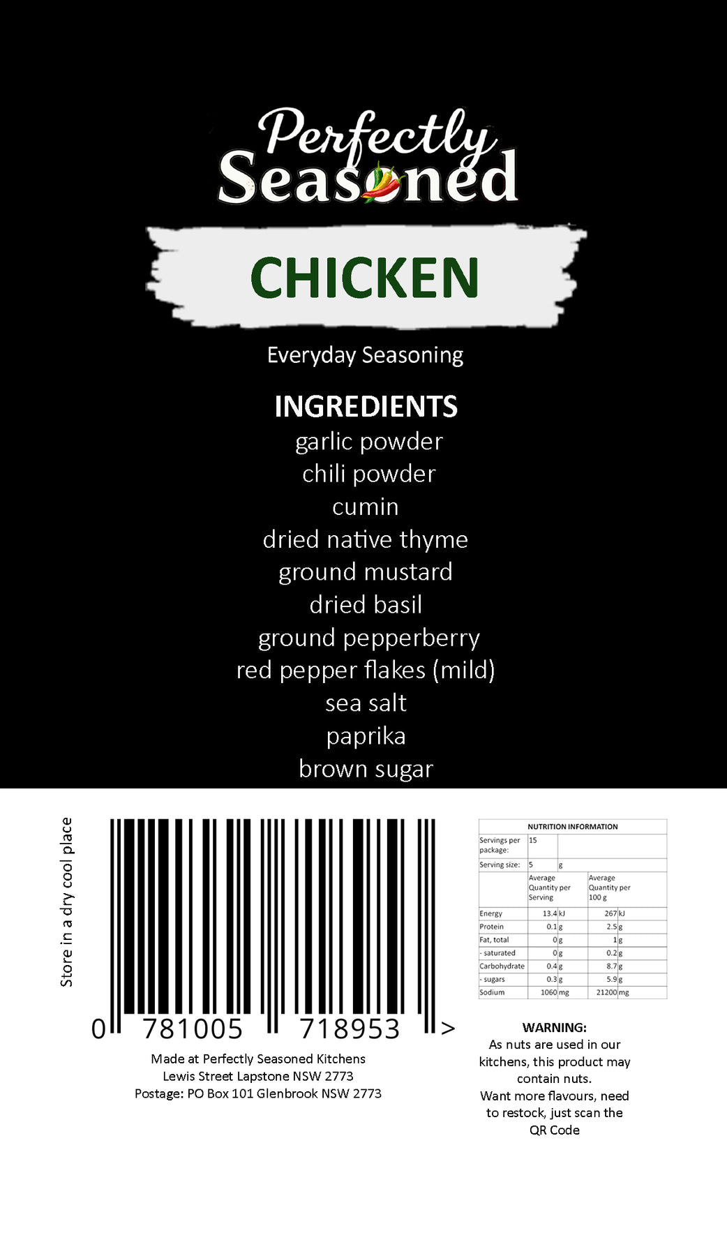 Ingredients: Garlic Powder, Chilli Powder, Cumin, Native Thyme, Ground Mustard, Dried Basil, Pepperberry, Red Pepper Flakes, Sea Salt, Paprika, Brown Sugar.